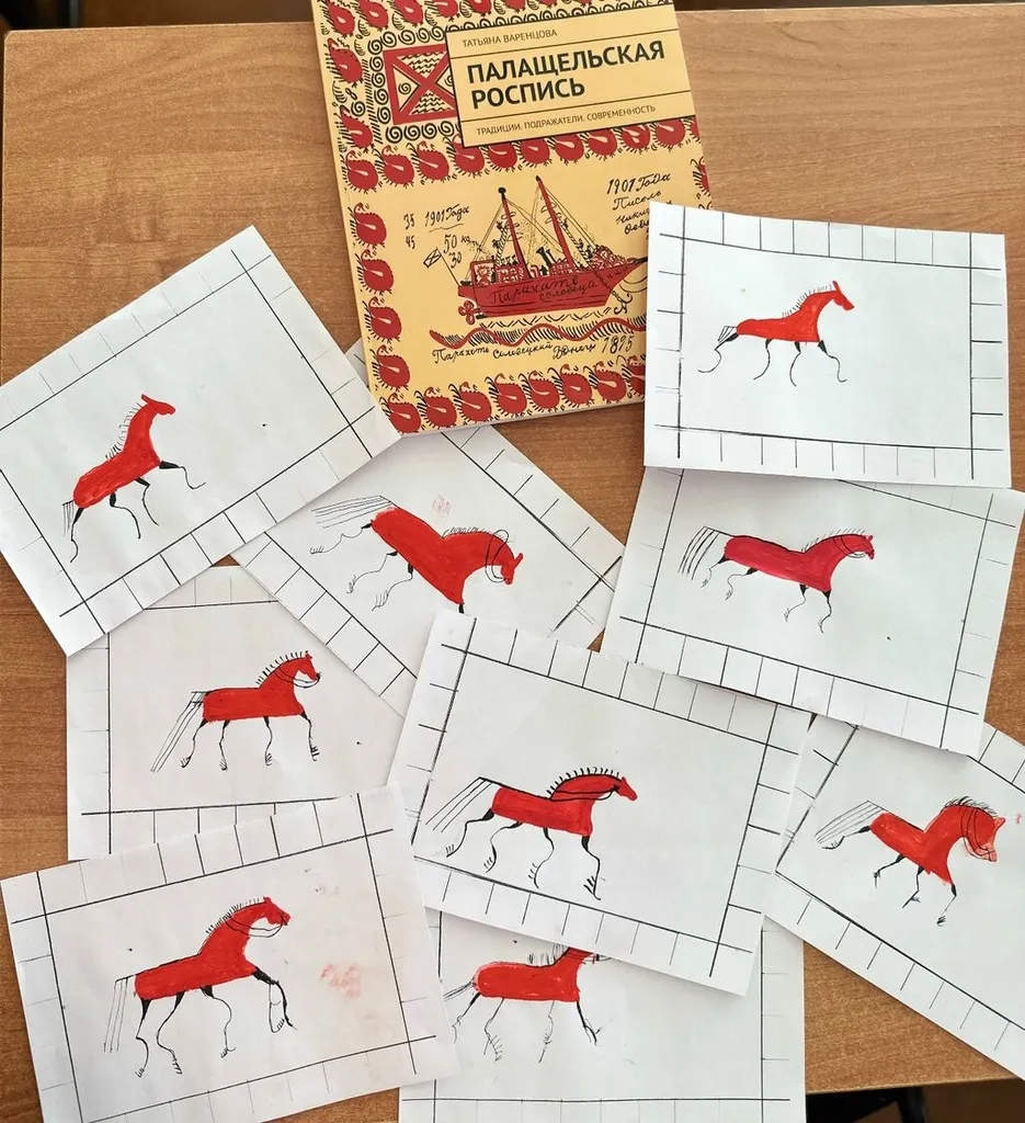 Младшие школьники с восторгом слушали рассказ и внимательно следили за каждым движением мастера. Под чутким руководством Татьяны Вячеславовны у каждого малыша получился свой собственный красный конь — главный символ мезенской росписи.